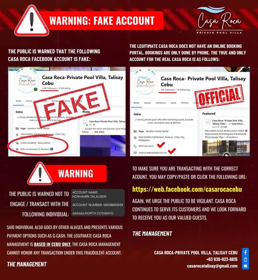 We’ve recently discovered unauthorized pages and individuals pretending to represent Casa Roca- Private Pool Villa, Talisay Cebu. These accounts are attempting to accept bookings and payments without our consent.